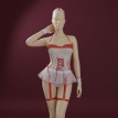 El corsé blanco presenta detalles estratégicos en rojo que acentúan la figura femenina de manera sofisticada. Los encajes y acabados del fabricante WHISPER garantizan una prenda que combina sensualidad con calidad. Cada elemento del conjunto está coordinado cromáticamente para crear un look cohesivo y atractivo. El contraste blanco-rojo evoca el uniforme clásico de enfermera con un toque provocativo y moderno.