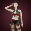 Incluye gorro de enfermera negro con cruz roja, top de encaje con transparencias estratégicas, minifalda tableada en tul negro translúcido, par de ligueros decorados con lazos rojos seductores y tanga de encaje negro. Todo lo necesario para una fantasía completa.