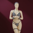 Conjunto sensual de 3 piezas con diseño de rayas modernas. Incluye brasier halter ajustable, tanga brasileña y diadema. Estilo deportivo-elegante que realza tu figura con comodidad.