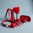 Conjunto integral que incluye esposas acolchadas con cierre seguro, látigo ergonómico de cuero sintético, antifaz ajustable con banda elástica, mordaza con bola de goma segura y pluma natural para estimulación sensorial. Cada pieza diseñada para máximo confort y seguridad durante el juego íntimo.