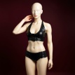 Conjunto íntimo de dos piezas en cuero sintético negro con acabado brillante. Incluye crop top tipo bandeau y shorts ajustados de tiro alto. Diseño fetiche minimalista que realza la silueta femenina con estilo elegante y provocativo.