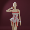 El corsé blanco presenta detalles estratégicos en rojo que acentúan la figura femenina de manera sofisticada. Los encajes y acabados del fabricante WHISPER garantizan una prenda que combina sensualidad con calidad. Cada elemento del conjunto está coordinado cromáticamente para crear un look cohesivo y atractivo. El contraste blanco-rojo evoca el uniforme clásico de enfermera con un toque provocativo y moderno.