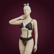 Conjunto completo de 5 piezas con diadema de orejas, body suspender de encaje negro con transparencias sensuales y detalles premium de plumas blancas. Diseño sofisticado para juegos de fantasía bunny.
